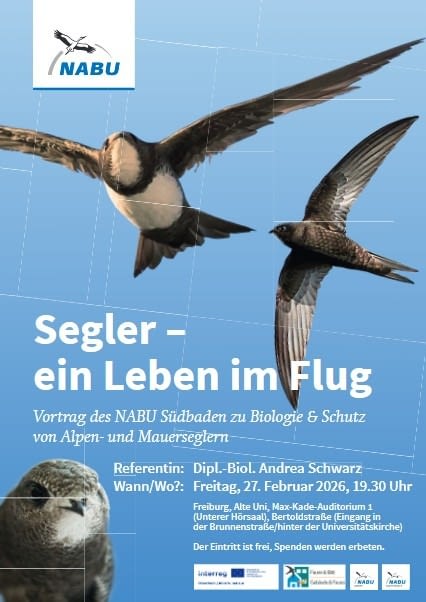 Der NABU Freiburg lädt am Freitag, 27. Februar 2026 zum spannenden Vortrag Segler – ein Leben im Flug ein Mauer- und die innerhalb Deutschlands nur im Südwesten vorkommenden Alpensegler leben außerhalb der Brutzeit ausschließlich in der Luft: Fressen, trinken, schlafen, sich paaren, Nistmaterial sammeln, putzen und mausern – alles wird fliegend erledigt.