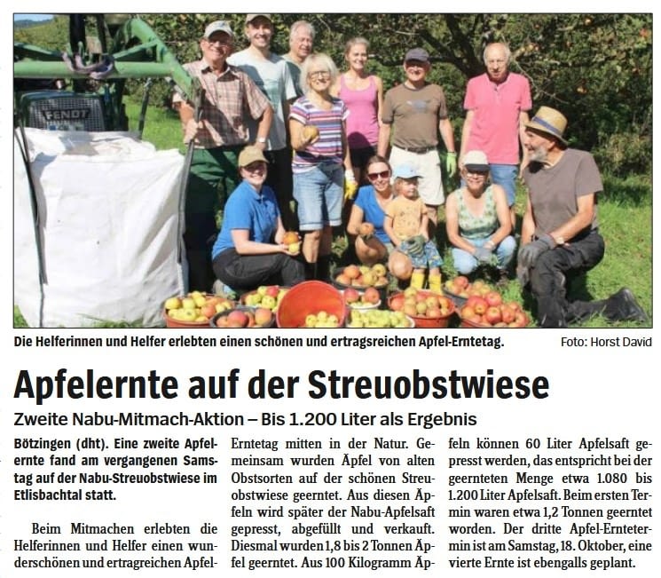 Wenn Anfang September die Äpfel auf den Streuobstwiesen reifen, heißt es für den NABU Kaiserstuhl: Ärmel hochkrempeln und los geht’s! An zwei Terminen, am 6. und 20. September, haben wir uns mit insgesamt jeweils 13 fleißigen Helferinnen und Helfern auf den Wiesen getroffen, um gemeinsam die Früchte des Sommers einzusammeln – und das mit bester Laune und bei herrlichem Wetter.