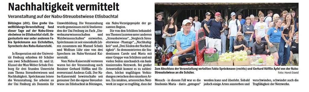 Im Juli 2024 fand auf der Streuobstwiese des NABU Kaiserstuhl eine besondere Umweltbildungsveranstaltung statt, die durch die Kooperation zwischen der Universität Freiburg und dem NABU Kaiserstuhl ermöglicht wurde. Im Rahmen des Unikurses „Walpädagogik“ organisierten Studierende der Uni Freiburg als Teil ihrer Abschlussprüfung eine praxisorientierte Veranstaltung für Schülerinnen und Schüler der Max-Weber-Schule aus Freiburg.